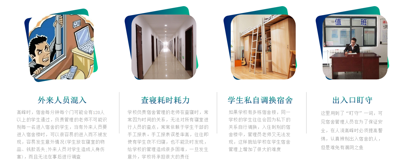 在學校的日常生活中,宿舍是一個重要的生活場景,宿舍區(qū)域是學生日常逗留時間最長的區(qū)域,也是社會屬性形成最快的區(qū)域,承擔著重要的育人職責。學生安全管理工作中,宿舍的安全也是重要的組成部分,由于宿舍為高頻的生活場景,出入事件時刻都在發(fā)生,如何隔絕外來人員的出入是宿舍安全的很重要部分。最近幾年,媒體頻繁曝光學生夜不歸宿引起的安全事故,學生的歸寢、查寢工作是學生安全管理工作的重要組成部分。綜上所述,宿舍場景在學校中承擔重要職責,宿舍的出入管理尤為重要,而此工作概括來說分為兩部分:不該進的不能進、該回來的要回來。