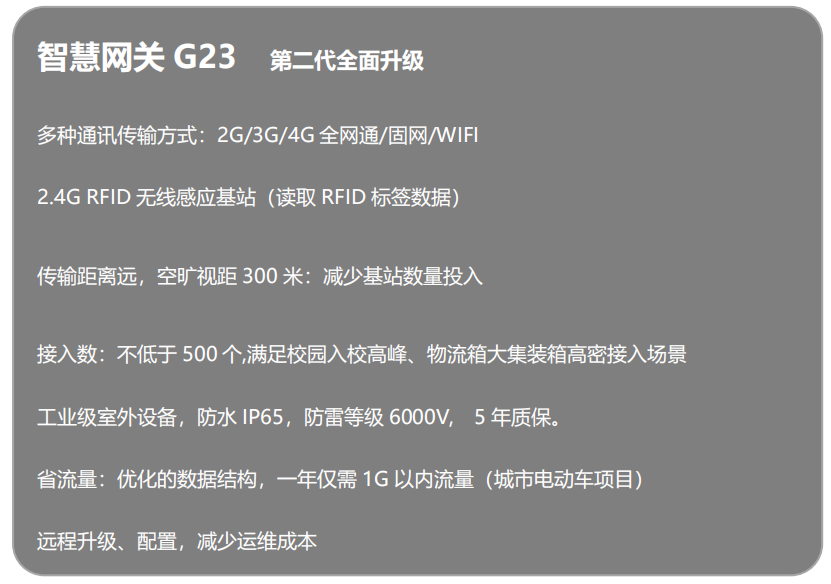 RFID無線感應(yīng)基站,用于讀取RFID電子標(biāo)簽數(shù)據(jù),并通過通訊網(wǎng)絡(luò)上傳到大數(shù)據(jù)平臺(tái)上。G23采用高性能高通9531無線方案,64MB大緩存可以同時(shí)接入不低于500個(gè)電子標(biāo)簽,滿足高密度接入的需求。采用工業(yè)級(jí)600M 主頻的MIPS硬件架構(gòu),高穩(wěn)定性,高在線率。采用LINUX嵌入式軟件架構(gòu),具有雙鏡像備份系統(tǒng),軟件升級(jí)時(shí)僅對備份系統(tǒng)升級(jí)成功后,才切換系統(tǒng),保障系統(tǒng)升級(jí)安全??蛇M(jìn)行遠(yuǎn)程配置管理。