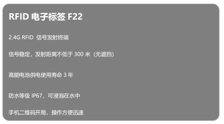 RFID電子標簽F22是任聯(lián)自主研發(fā)的2.4G RFID無線信號發(fā)射終端,經過無線感應基站時,基站感應到RFID電子標簽并上傳到大數(shù)據(jù)后臺,通過基站的位置刻畫出電子標簽運動的軌跡。F22采用成熟方案,功耗低,成本低,性價比高,目前廣泛用于成熟應用在智慧城市電動車防盜解決方案、智慧小區(qū)、資產管理等基于位置定位的解決方案中。