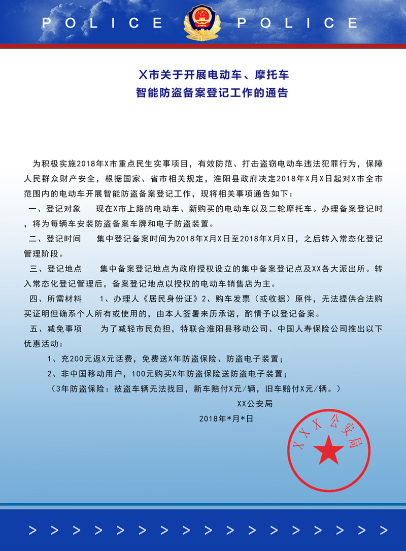 3、二輪電動(dòng)車的備案登記不只是上牌,同時(shí)對(duì)電動(dòng)車的科學(xué)管理、基于電動(dòng)車的社會(huì)治安防控體系建設(shè)都是有巨大的作用,所以在通告發(fā)布單位上一定要聯(lián)合當(dāng)?shù)氐木C治辦。