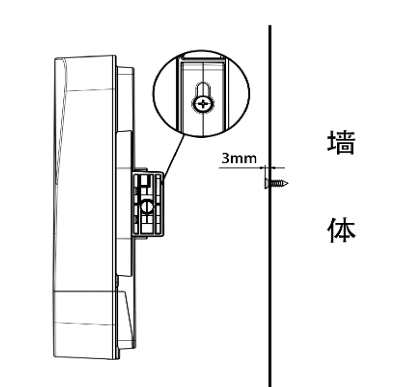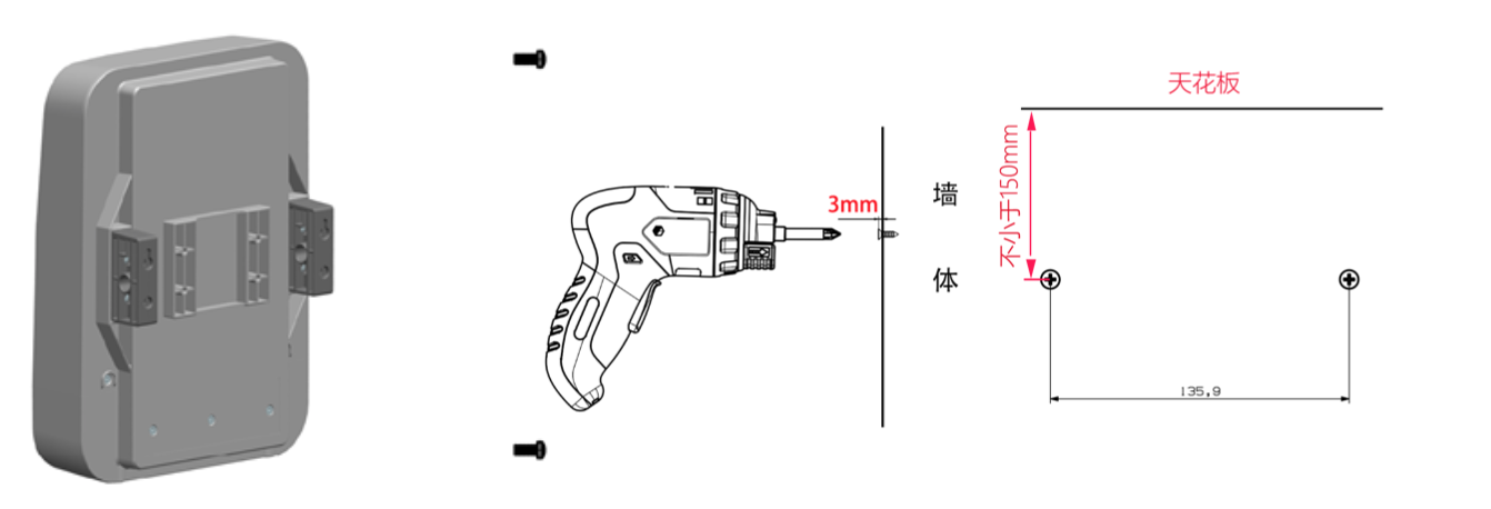 1、2顆膨脹螺釘固定在墻壁上,螺釘頭面距離墻壁至少留3mm,螺釘?shù)乃街行木?35.9mm,螺釘距離天花板位置不小于150mm,螺釘?shù)奈恢萌缦聢D所示