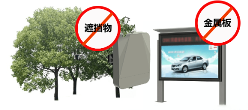 1) 感應基站的正面和側面不能有遮擋物,比如:樹枝、金屬板等,如下圖是不正確的場景:
