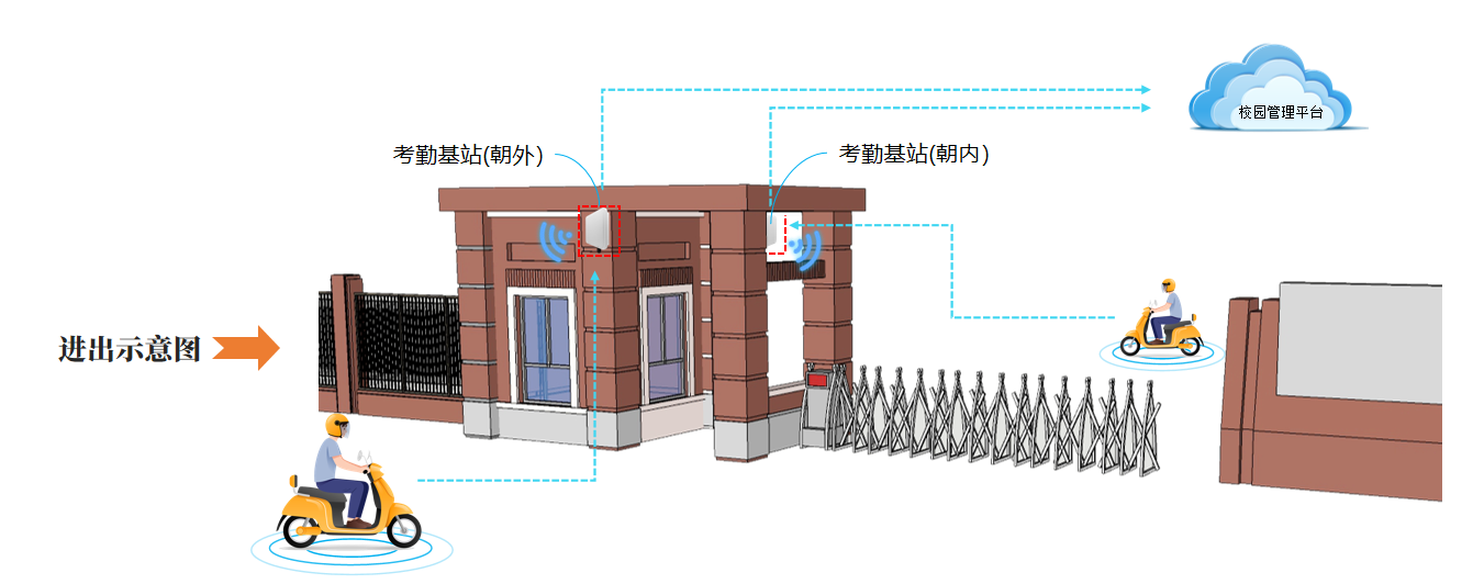 - 電動車安裝電子車牌; 并將電動車車主信息與之綁定并且錄入后臺系統(tǒng),錄入系統(tǒng)后的車輛經(jīng)過考勤基站才能正常通行;
