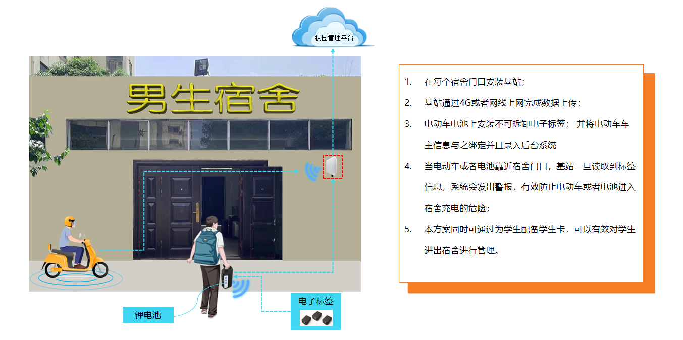 為維護(hù)校園良好的教學(xué)、工作和生活秩序,保障師生員工人身安全和校園財(cái)產(chǎn)安全,減少各類事故發(fā)生,營建良好的校園環(huán)境和停車秩序,本方案采用人工智能和物聯(lián)網(wǎng)技術(shù),結(jié)合云計(jì)算和大數(shù)據(jù)技術(shù),通過車輛識別感知+平臺監(jiān)控+充電與行車大數(shù)據(jù)分析,可對校園電動自行車輛的進(jìn)出自動識別,防止電動車入宿舍停放和充電管理,電瓶入室充電管理,校園里亂停亂放管理,車輛防盜等,數(shù)據(jù)采集和報(bào)警信息自動回傳綜合平臺,有效實(shí)現(xiàn)校區(qū)電動車安全與規(guī)范使用的綜合治理目標(biāo)。