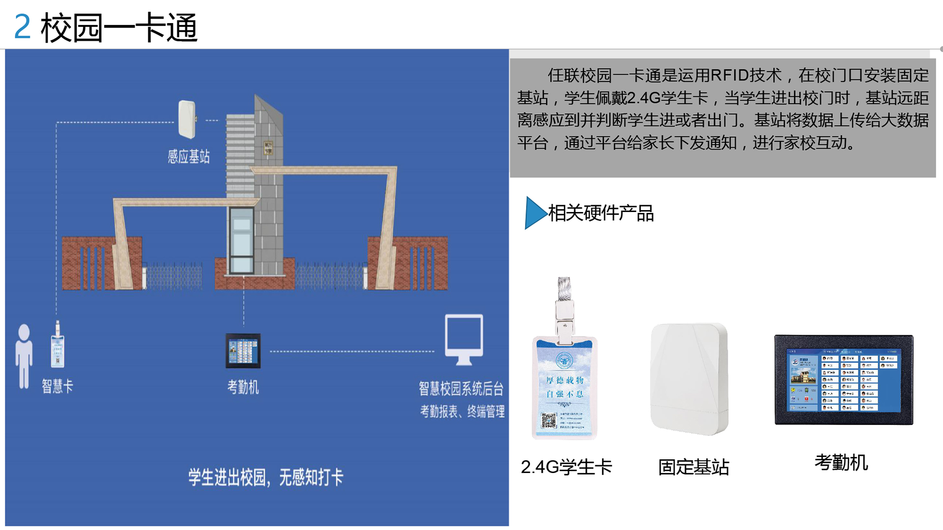 采用2.4GHz和13.56MHz高低雙頻混合技術(shù),2.4G高頻段用于進(jìn)出校門的遠(yuǎn)距離考勤刷卡,13.56M低頻段可用于宿舍門禁、飯?zhí)孟M(fèi)、打親情電話等近距離刷卡場合,一卡多用,方便攜帶。