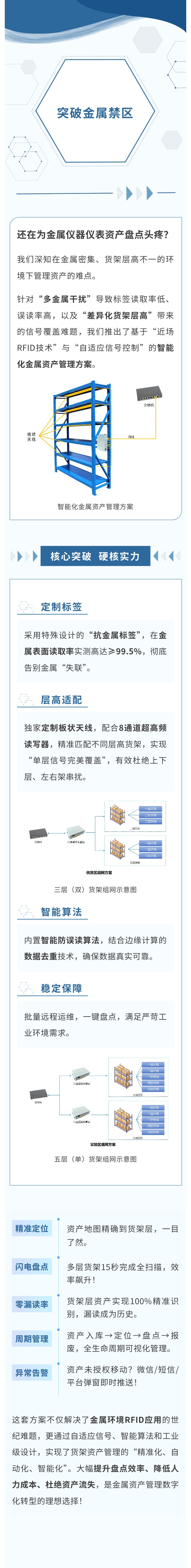 我們深知在金屬密集、貨架層高不一的環(huán)境下管理資產(chǎn)的難點(diǎn)。 針對(duì)“多金屬干擾”導(dǎo)致標(biāo)簽讀取率低、誤讀率高,以及“差異化貨架層高”帶來(lái)的信號(hào)覆蓋難題,我們推出了基于“近場(chǎng)RFID技術(shù)”與“自適應(yīng)信號(hào)控制”的智能化金屬資產(chǎn)管理方案。